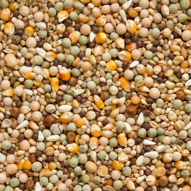Petits pois verts 15%, petits pois jaunes 14%, froment blanc 12%, dari 10%, maïs popcorn 10%, petit maïs cribbs 10%, vesces 8%, cardi 6%, chanvre 5%, maple peas 5%, riz paddy 3%, soja torrefié 2%