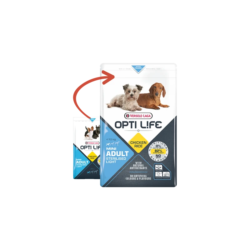 Opti Life Adult Sterilised/Light Mini est une formule parfaitement équilibrée pour les petites races (-10kg) à base de poulet et de riz contribuant à maîtriser le poids corporel de votre chien.