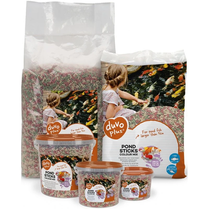 Débutez la journée de vos poissons de bassin avec duvoplus pond sticks. Car ces bâtonnets renferment tout ce dont ils ont besoin et sont faciles à digérer. Un étang plein de vie, voilà l’objectif que nous poursuivons chez duvoplus ! duvoplus pond sticks est un aliment complet qui se compose de 3 bâtonnets différents pour tous les poissons de bassin à partir de 5 cm. Ces bâtonnets flottants d`un diamètre de 4 mm sont délicieux et parfaitement adaptés aux besoins alimentaires de vos poissons.