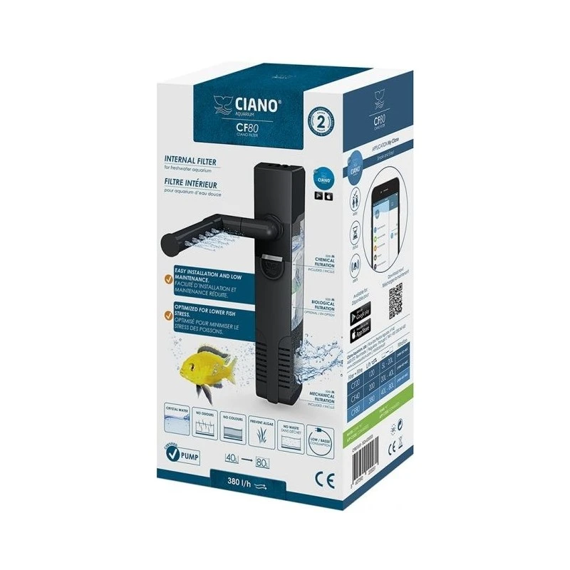 CF80 Ciano® est un filtre intérieur de haute performance, facile à installer et d’une maintenance réduite. Optimisé pour minimiser le stress des poissons. Idéal pour les aquariums de 40 à 80 litres. Inclus: – 1 Barre de pulvérisation (Répartition plus uniforme de l’eau et une oxygénation accrue) – 1 WATER CLEAR & PROTECTION Taille M; – 1 WATER FOAM 30 PPI Taille M. Moteur 380 L/l. Volume minimum 40 L Volume maximum 80 L