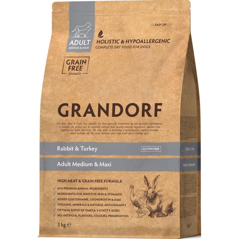 Viande de lapin déshydratée, Viande de dinde déshydratée, Patate douce séchée, Viande de lapin fraîche, Graisse de dinde, Épinards séchés, Chicorée séchée (une source naturelle de prébiotiques: FOS et inuline), farine de caroube, pomme séchée, krill antarctique séché (source naturelle d’EPA et de DHA), graines de lin, DL-méthionine, glucosamine, chondroïtine, MSM (méthylsulfonylméthane), mélange d’antioxydants naturels (Rosmarinus, Vinis, Curcuma, Citrus, Syzygium). Naturellement conservé avec des tocophérols et du romarin Énergie métabolique: 3,960 kcal/kg