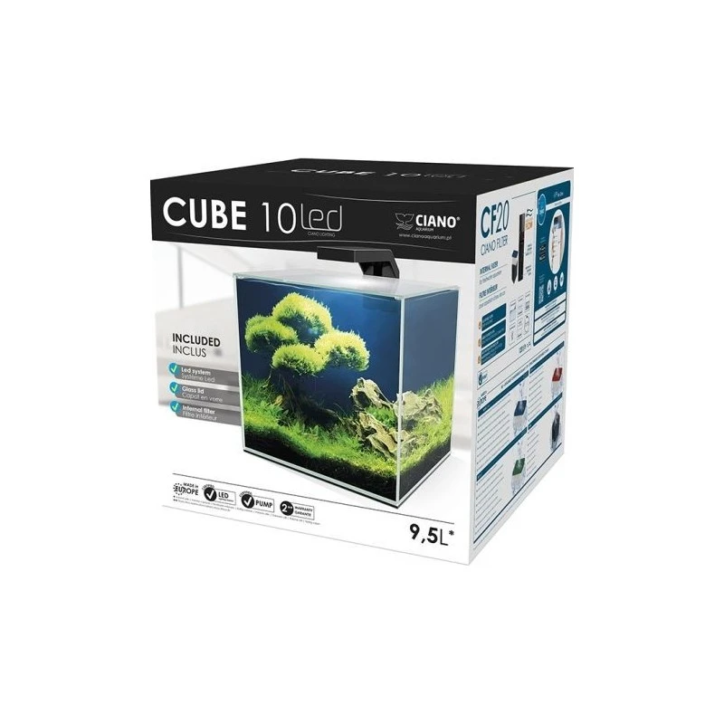 Le CUBE 10 est un petit aquarium en verre facile à utiliser, qui s’adaptera facilement à toute pièce de votre logement. – 1 Filtre intérieur CF20 Ciano®; Inclus: – 1 WATER CLEAR & PROTECTION Taille S; – 1 WATER FOAM Taille S; – 1 LED CLA20 Universal Ciano® (1,5W – 12VDC); – 1 Capot en verre .
