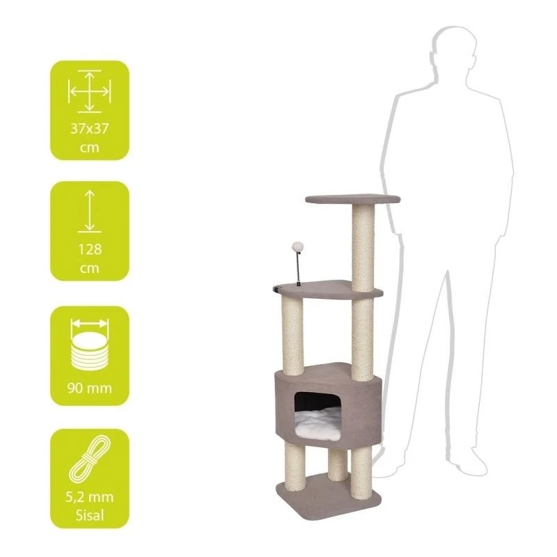 Les chats ont besoin d’un griffoir de qualité pour prendre soin de leurs griffes et marquer leur territoire. Le sisal est une fibre naturelle très robuste qui aide le chat à enlever la couche supérieure floconneuse de ses griffes et qui empêche donc la croissance des griffes. Un griffoir est donc indispensable pour chaque chat ! L’arbre à chat ‘Kobe’ d’EBI, de design néerlandais, s’inspire du concept japonais Zen. L’esthétique de cet arbre à chat est empreinte de calme et de minimalisme. Recouvert d’un tissu doux, cet arbre est adapté à chaque intérieur. Il est également muni d’un abri de coin surélevé avec coussin en peluche pour un sommeil très confortable. Au-dessus de l’abri, nous avons prévu deux plateformes qui permettent au chat d’assouvir son besoin d’escalade et de trouver l’endroit parfait pour une vue d’ensemble. Les deux niveaux contiennent de la mousse sous le tissu. Cet arbre à chat est donc le lieu de détente parfait pour votre chat. Et le jouet sur ressort assure un divertissement supplémentaire.