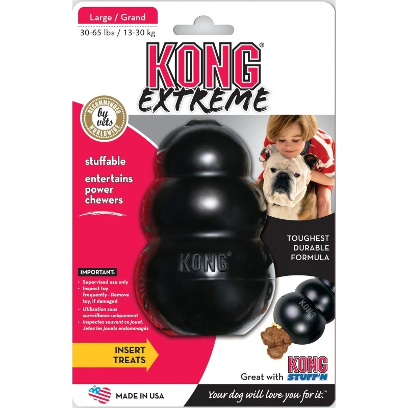 KONG Extreme représente la version la plus résistante de notre jouet KONG original. Sa matière en caoutchouc noir ultra-robuste et ultra-résistante est recommandée pour les mâchoires les plus puissantes.