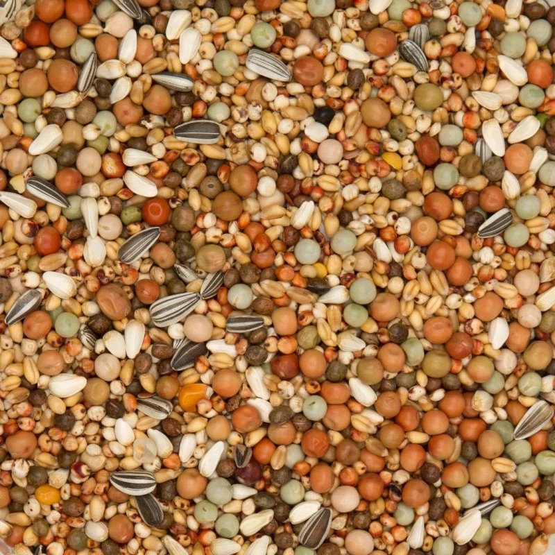 Froment blanc 20%, sorgho rouge 16%, dari 15%, dunpeas 15%, vesces 10%, petits pois verts 6,5%, cardi 5,5%, petits pois jaunes 5%, graines de lin 2%, tournesols striés 2%, winterpeas 2%, colza 1%