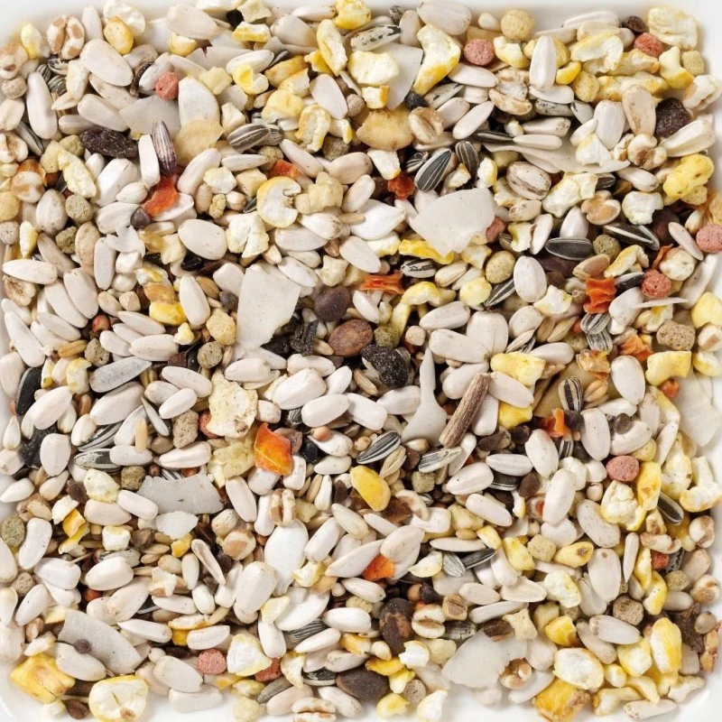 Tournesols blancs 16%, cardi 11%, premix fruits perroquets 12%, sarrasin 9%, tournesols striés 7%, avoine pelée 10%, chanvre 4%, sorgho roux 10%, dari/sorgho Blanc 6%, froment 6%, orge 3%, granulé extrudé 3%, graines de citrouille 1%, noix de cèdre 2%