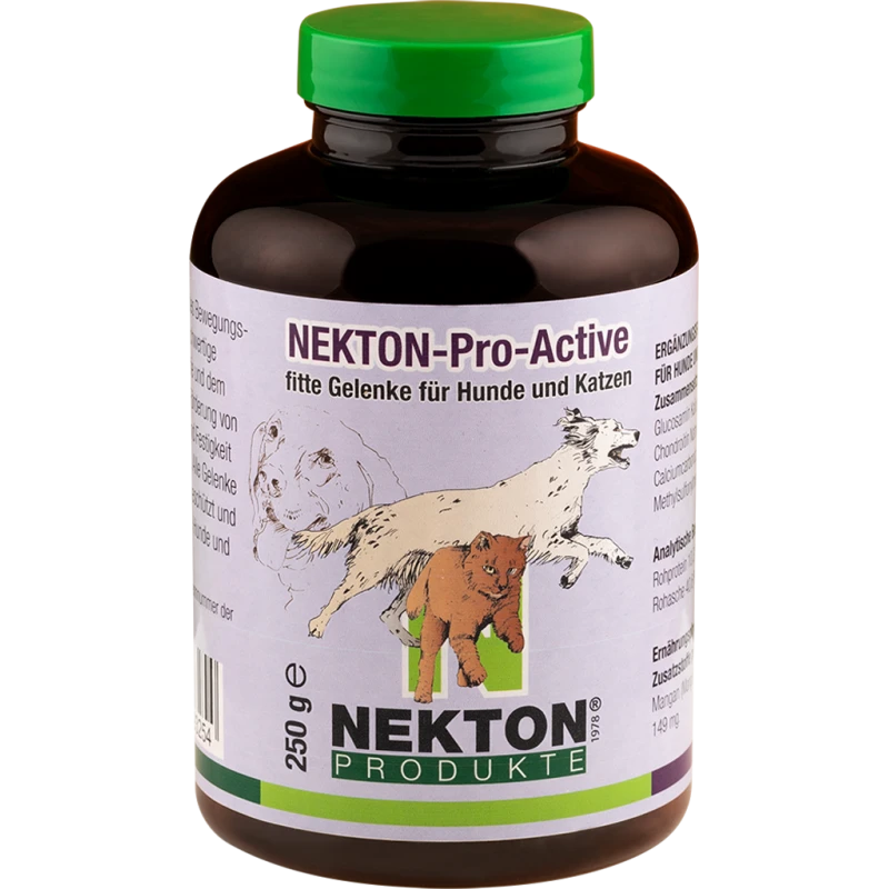 NEKTON-Pro-Active contient des ingrédients naturels et d’une grande valeur nutritive tels que la glucosamine, la chondroïtine ainsi que le composant méthyl-sulfonyl-méthane (MSM). La combinaison de ces éléments importants pour les articulations est utilisée depuis longtemps et avec succès pour traiter les douleurs articulaires chez l’homme et peut l’être également sans problème chez l’animal. NEKTON-Pro-Active vise à soutenir la structure, le fonctionnement et la solidité du cartilage articulaire. Pour les animaux actifs, une demi-dose par jour à titre préventif et pour rester en bonne santé. Les animaux déjà malades (souffrant d’arthrose par ex.) devront recevoir une dose plus importante afin d’améliorer leur état de santé. Toutes les articulations de l’animal seront protégées, soutenues et mobilisées. NEKTON-Pro-Active n’est pas un médicament et dévoile toute son efficacité après avoir été utilisé de façon ininterrompue durant env. 15 jours.