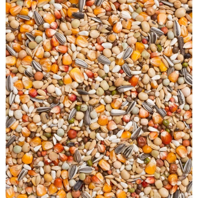 petit mais cribbs 20%, froment blanc 10% , soja torréfié 7%, dari blanc 7%, riz Paddy 6%, mais merano 5%, cardi 5%, petits pois jaunes 4%, petits pois verts 4%, vesces 3%, sorgho extra rouge 3%, lentilles 3%, avoine pelée 3%, chanvre 3%, pois dunpeas 2%, orge 2%, tournesols striés 2%, kadjang idjoe 2%, navettes 2%, pois maple peas 2%, chardon marie 1%, graine de lin 1%, millet jaune 1%, alpistes 1%.