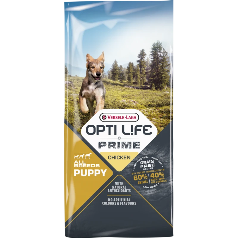 Avec Opti Life Prime Puppy vous servez à votre chiot un repas premium, riche, délicieux et débordant de nutriments puissants. Notre recette sans céréales est riche en protéines et en graisses, et pauvre en glucides, avec le mélange idéal d’ingrédients de la plus haute qualité, les plus savoureux et les plus naturels pour une journée pleine d’aventures.