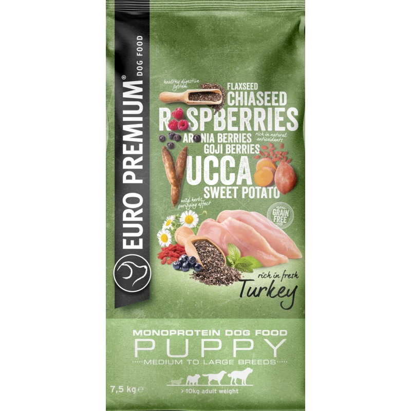 Un produit entièrement sur mesure pour votre chien. Un produit alimentaire équilibré, riche en viande fraîche, agrémenté d’une multitude de fruits, d’herbes et sans céréales. Cet aliment se compose d’ingrédients bien dégistibles triés sur le volet et de dinde pour une source unique de protéines animales. La chicorée séchée apporte de l’inuline pour stimuler la fonction intestinale. Le yucca est ajouté pour atténuer l’odeur des selles. Euro-Premium Medium/Large Puppy Turkey est enrichi d’une combinaison d’huile de saumon et d’huile de tournesol pour un ratio idéal d’oméga-3 en d’oméga-6. Ses antioxydants naturels dérivés de super aliments (baies de goji, framboises et baies d’ariona) renforcent le système immunitaire.