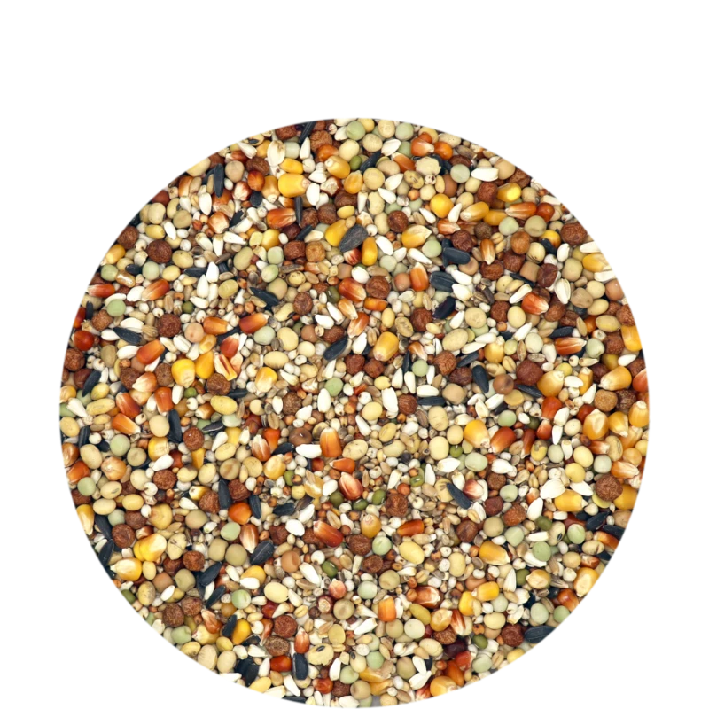 maïs rouge 10%, maïs cribs premium 7%, graines de soja toasté 10%, maple peas 10%, dun peas 6%, petits pois verts 6%, katjang idjoe 2%, froment blanc 10%, dari blanc 10%, dari rouge 7%, cardy 9%, orge pelée 2%, riz paddy 2%, chanvre 4%, graines de tournesol noir 2%, millet jaune 1%, graines de lin jaune 1%, graines de chardon-marie 1%