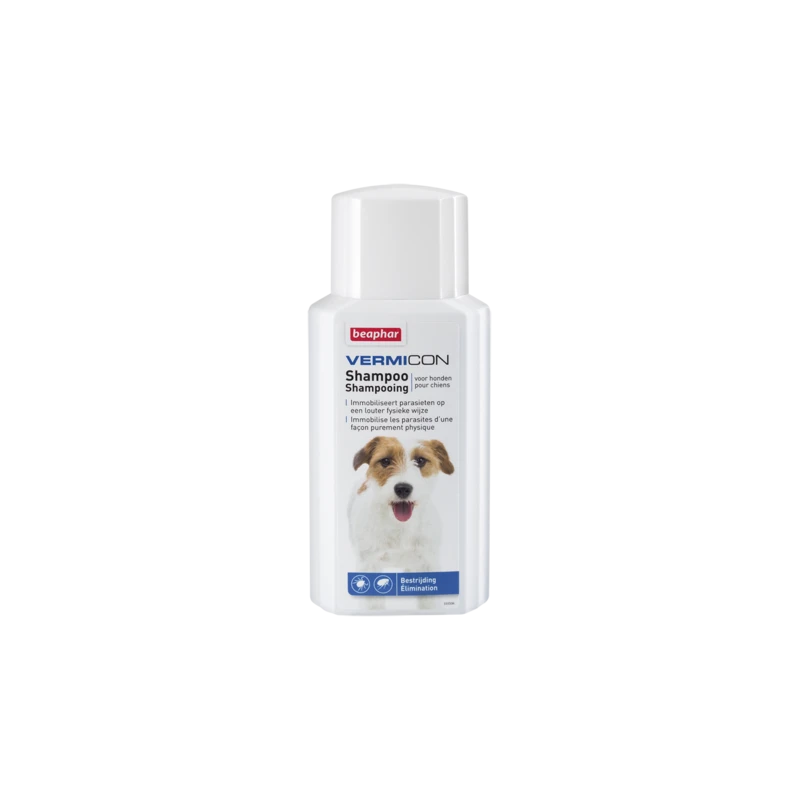 Le Vermicon Shampooing à base de Dimethicon immobilise les puces, tiques et insectes tels que les moustiques, mites, poux, phlébotomes etc. de façon purement physique. Le shampooing ne contient pas d’insecticides chimiques. Le Dimethicon forme une pellicule qui agit comme un ‘sticky trap’: les puces, tiques et insectes sont paralysés par immobilisation physique de leurs articulations. Le Dimethicon fonctionne lors de tous les cycles de vie de la puce.